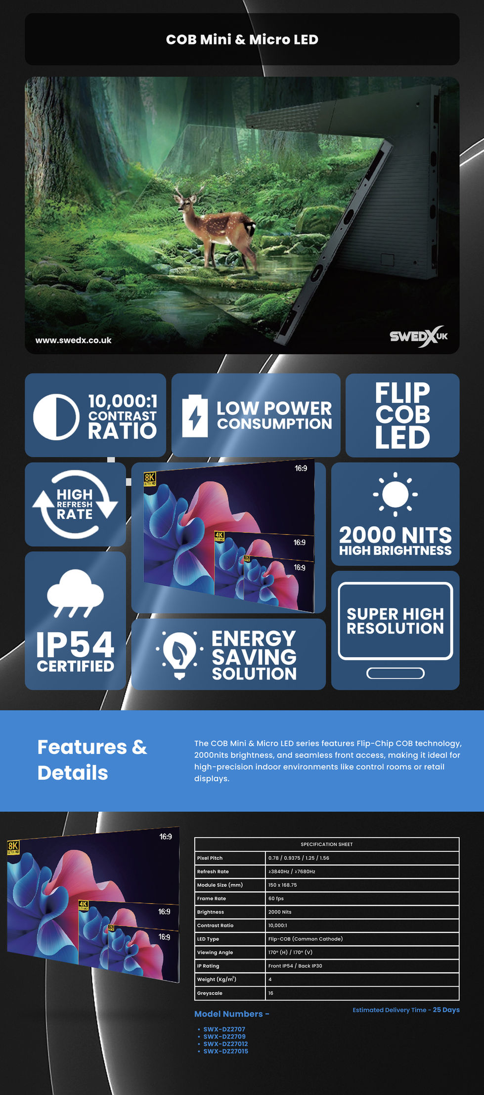 The COB Mini & Micro LED series features Flip-Chip COB technology, 2000nits brightness, and seamless front access, making it ideal for high-precision indoor environments like control rooms or retail displays.