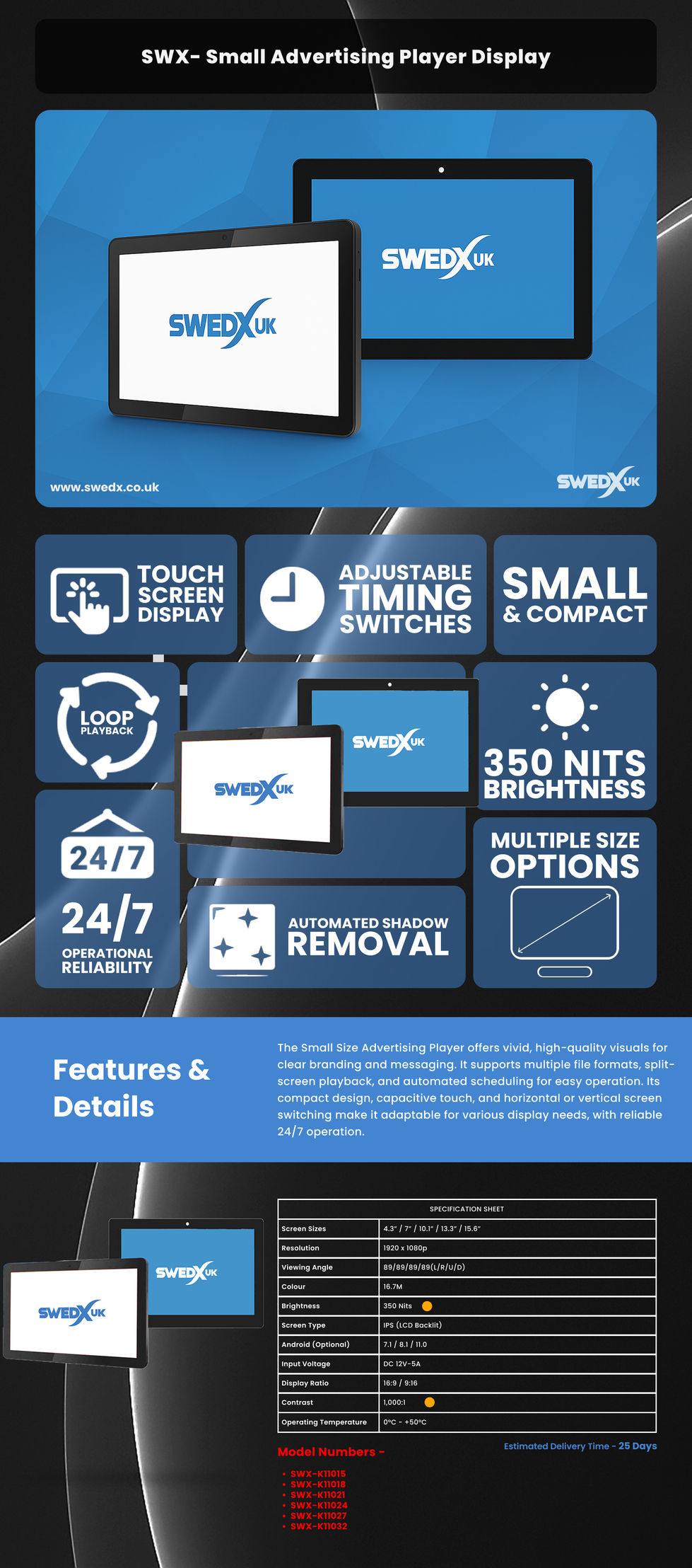 The SWX Small Advertising Player delivers high-quality visuals in a compact form factor. It supports touch control, automatic loop playback, and shadow removal, ideal for continuous branding and messaging in space-constrained environments.